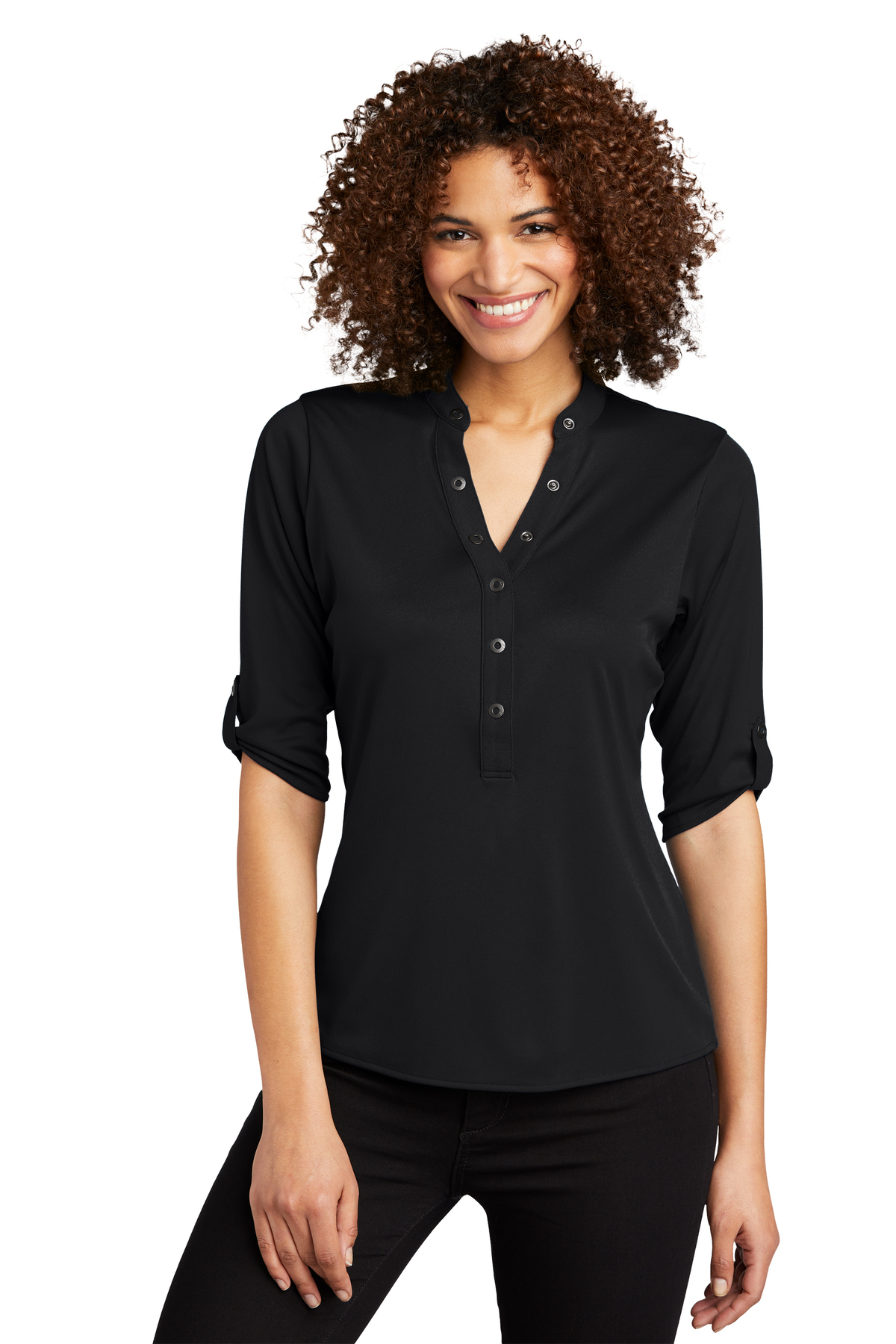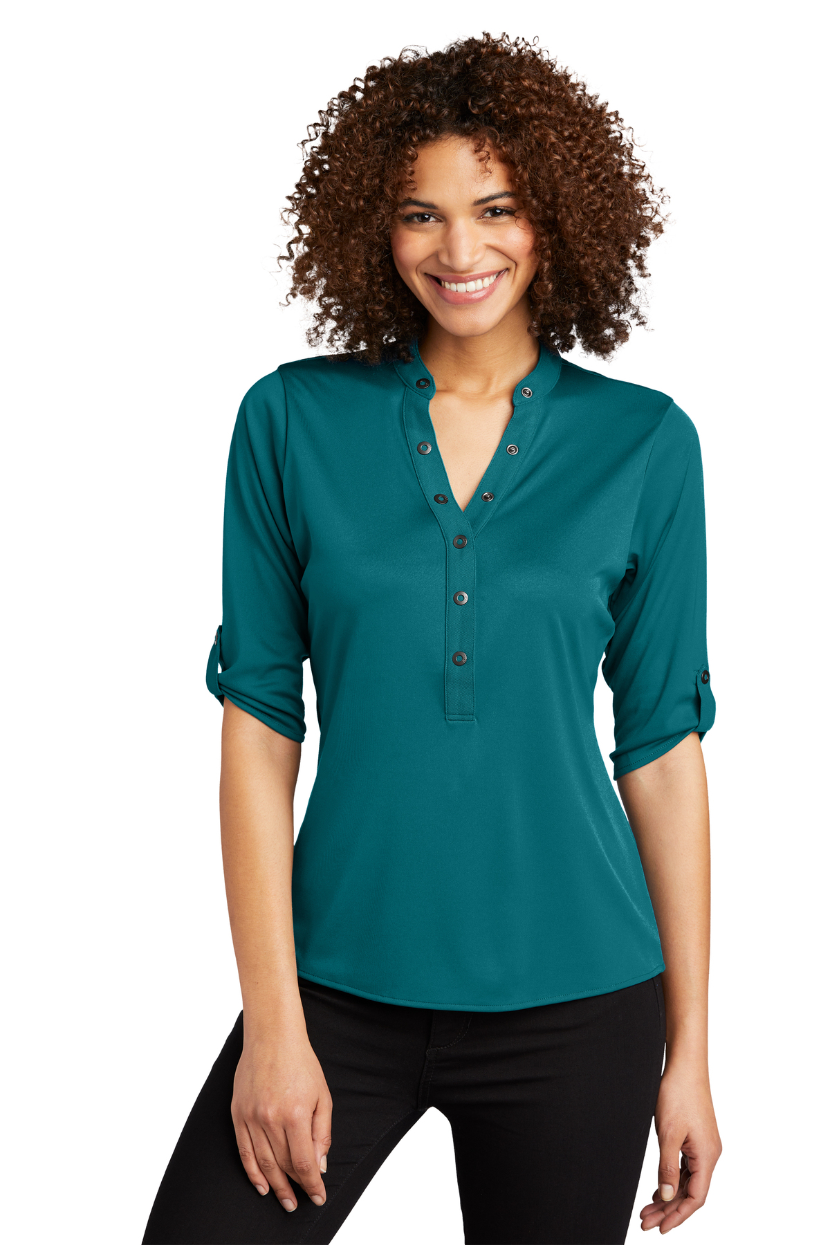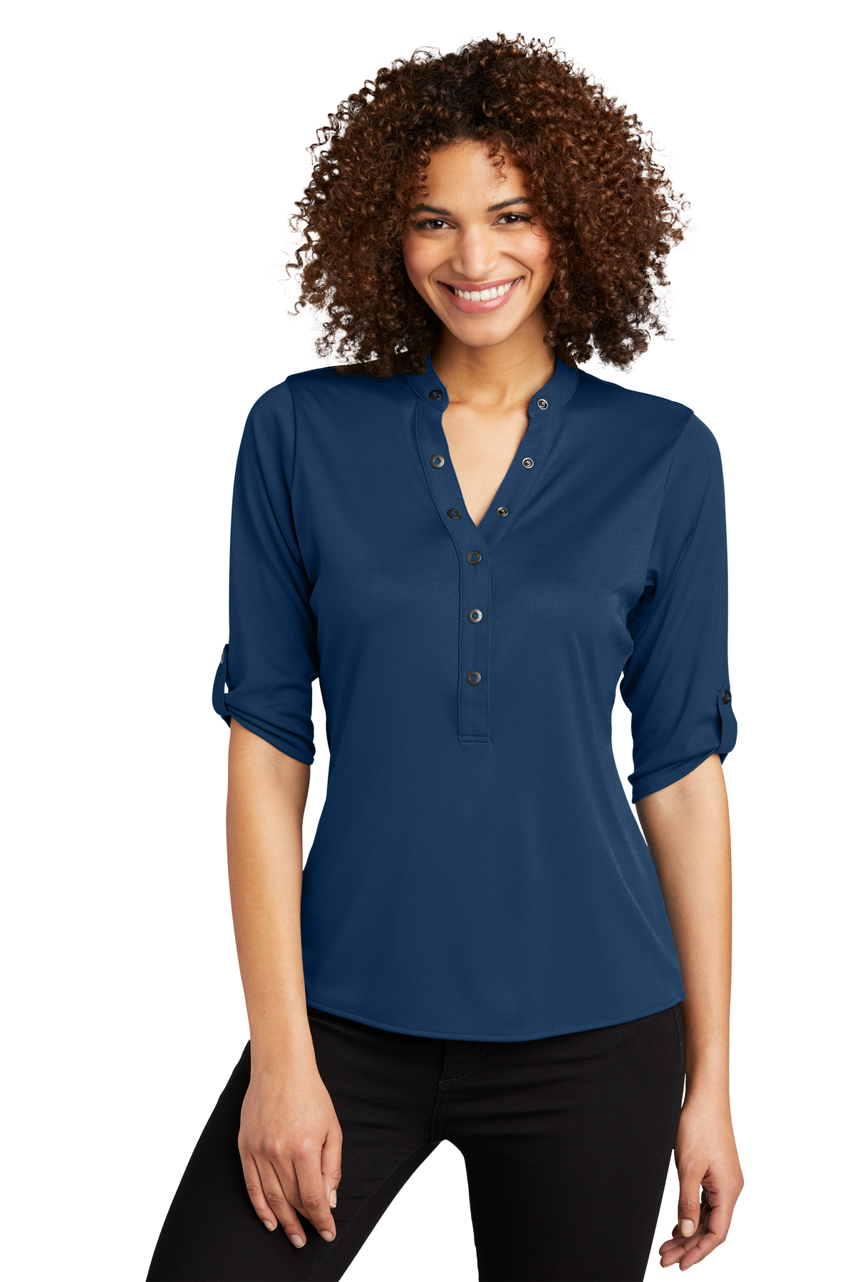 If you love shirts that don't need to be ironed and come out of the dryer perfect every time, then this is the top for you! It's a very soft, smooth material that resists wrinkles. The cute grommet details at the neckline make it look very fresh and current. You can dress it up with dress pants or wear this with jeans, and both options look great! It fits very true to size, so I'd recommend ordering your normal go-to size.
